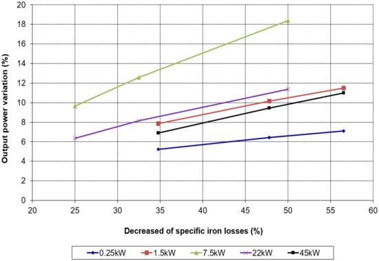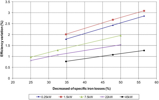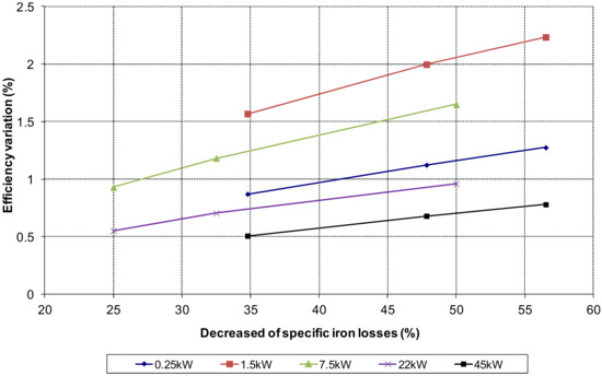 Efficiency variation versus decreased of specific iron losses in all the motors (equal output power criteria).