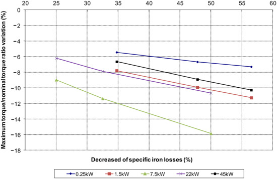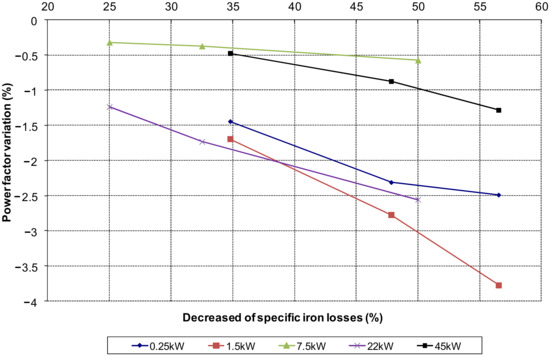 Power factor variation versus decreased of specific iron losses in all the motors.