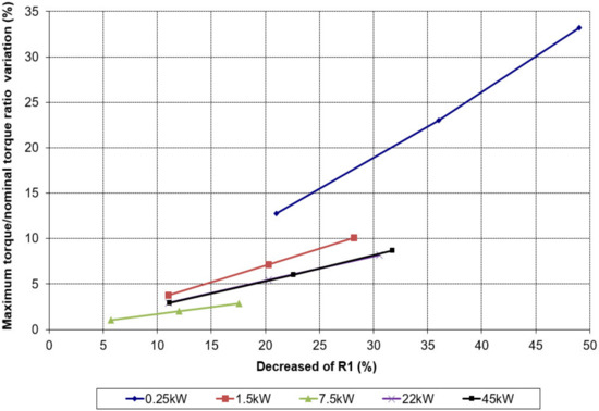 Maximum torque/nominal torque variation versus decreased of R1 in all the motors.