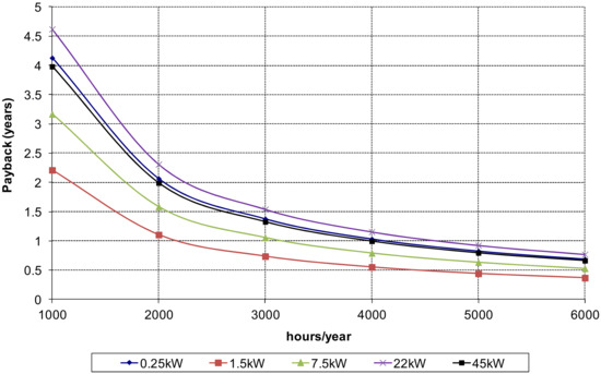 As this economic assessment is very sensitive to the number of hours of annual motor operation, Figure 19 shows the evolution of the payback according to the number of hours/year, considering a duty cycle of 45% of hours at full load, 35% of hours at 3/4 of full load and 20% of hours at 1/2 of full load [22]. Although these results have not been evaluated in this study, they would allow an analysis of the environmental impact derived from the measures adopted, with reference to the materials used and the associated energy savings, through the study of the life cycle of modified motors compared to initial motors [23,24].