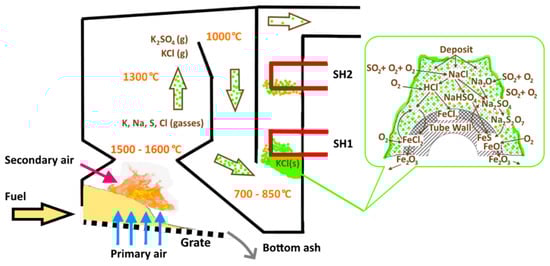 Fouling by KCl in a fixed bed straw boiler (left), with chloride and sulfide corrosion mechanism (right)—adapted, based on [34,35] (SH1 and 2—sections of the superheaters in the boiler).