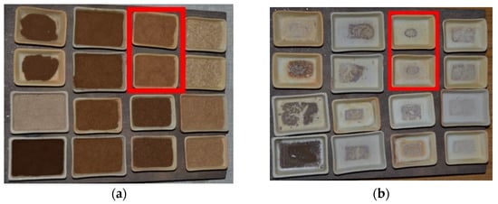 Miscanthus after wet torrefaction in different process conditions (samples after wet torrefaction in 200 °C, 10 min, water: biomass ratio 12:1): (a) raw samples; (b) samples after 3 h of ashing in the furnace at 850 °C.