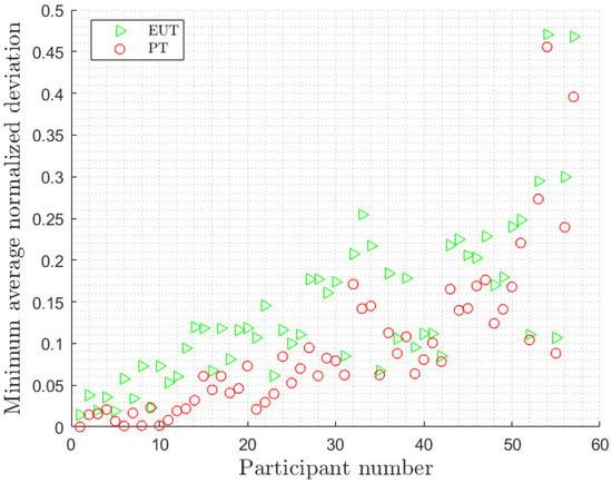The minimum average normalized deviation (MAND) between actual and predicted number of units sold for the EUT and PT models. Each participant is represented by two marks that shows minimum average normalized deviation for each model. The plot demonstrates that the PT model outperforms EUT in terms of prediction prosumer behavior. The 57 study participants are ordered across the x axis, from the participant who sold units on the fewest number of days to the participant who sold on the most number of days.