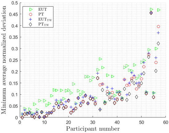 The minimum average normalized deviation between actual and predicted number of units sold for EUT, PT, EUTTW, and PTTW. Each participant is represented by four marks that show the minimum average normalized deviation for each model.