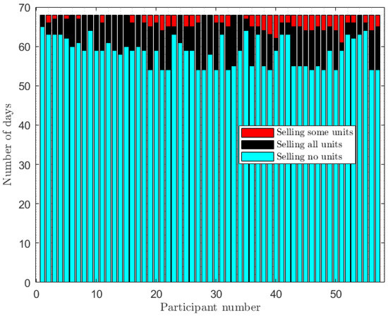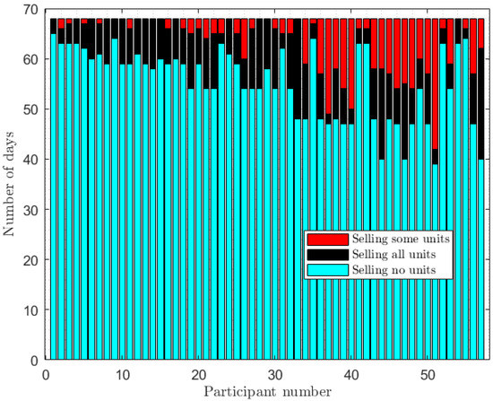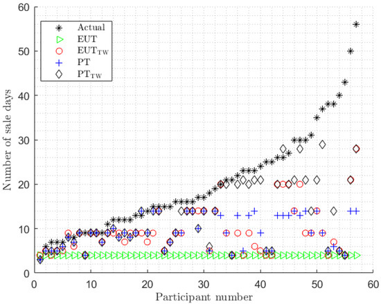 Figure 4 shows the number of sale days predicted by each model, and the actual number days on which each of the 57 participants sold during the course of the study. It can be observed that EUT predicts that rational prosumers would sell their surplus energy units on just four days–the three days when the price exceeded the cutoff price and on the final day (as the probability of selling any units at any price on a subsequent day is zero)–and this prediction is the same for all participants. However, introducing the notion of time window to classic EUT can improve its performance. Although the frequency of selling in EUTTW is greater than EUT (and thus, closer to observed behavior), the extended model, EUTTW, still suffers from predicting either sell all or none of the available units [21]. Figure 4 also shows that both PT and PTTW have a better fit to the participants’ selling behavior than do the EUT models.