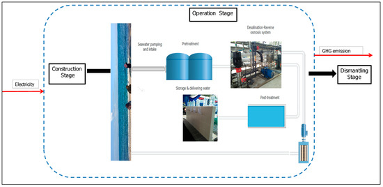 In order to obtain accurate data on the carbon footprint, inventory-based questionnaires were developed and sent to SWRO plant maintenance personnel, and to several stakeholders, such as contractor developers, site managers, engineers, village heads and other individuals who are directly involved in Kampung Senok, Kelantan. Among the information that was deemed acceptable, only complete and analytical, numerical, and empirical data were available, including some validated and accepted laboratory test results. The LCA method, in accordance with ISO14040-43 guidelines [17,18], was simplified to, first, goal setting and scope. The working unit selected was 1 cubic meter of treated water produced from a salt water desalination source. The second step was the development of the content of the inventory data, in which the mining of material input data output was presented as an LCI chart. Third, life cycle impact assessment (LCIA) using Simapro 8.5 software was performed on a single inventory spreadsheet. The latter enabled the presentation of decisions by implementing data interpretation. Figure 1 shows the system of study boundaries involving the extraction, treatment, and preparation of desalinated water. This study excluded carbon emissions from decorative materials because of data that are related to poor usability.