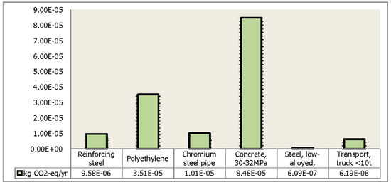 The Senok desalination plant can be considered to be at its infancy stage, having been operated for only two years. It is hard to determine the indirect release of carbon during its early phases of construction due to reliability issues with the initial raw data, such as that relating to utilities, including electrical and water consumption and human resources, piling/ground work, land clearing, energy recovery devices, filters and membranes, and pumps. Therefore, only six compartments were investigated in this study. Figure 2 shows the use of concrete building materials contributing the most to greenhouse gas (GHG) emission at 8.48 × 10−5 kg CO2-eq, followed by polyethylene and trucks at 3.51 × 10−5 and 6.19 × 10−6 kg CO2-eq, respectively. The total GHG emission was 1.46 × 10−4 kg CO2-eq, which accounted for 55% of this phase. Several important steps can be implemented in the future to reduce the GHG emission by requiring specific reporting, such as an environmental impact assessment (EIA). However, in this study, the EIA report was not necessary due to the small plant scale [23]. In terms of materials, the cost-saving factor in the procurement of certain raw materials can also reduce the carbon footprint [24,25]. Moreover, the introduction of an incentive policy of Renewable Energy Power Purchase Agreements, under the FiT: Feed-in-Tariff and “MyPower” mechanism by KeTTHA and TNB, for the SWRO Senok plant, should be reviewed in terms of feasibility.