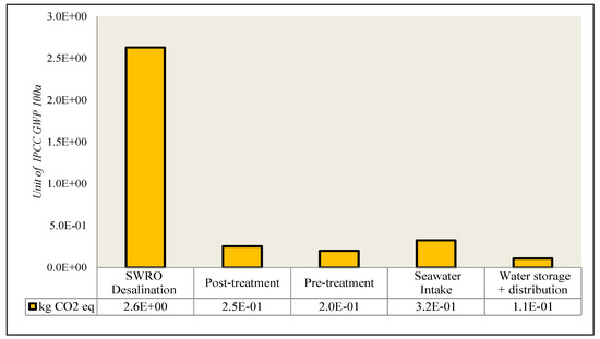 In the estimation of the potential GHG emissions, the IPCC 2013 approach was adopted, which is the global warming potential (GWP) for a period of 100 years [20]. Table 3 shows the sustainability composition values for a RO desalination plant with local electrical energy sources. The basic solution to calculate the CO2 equivalent emission factor and carbon footprint used Equations (1) and (2), with the values of 1, 21, and 310 for GWP multipliers [21,22]. However, this study did not consider the embodied energy and embodied GHG emissions.