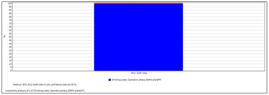 Figure 5 depicts the intensity of quantitative uncertainty for the operation stage, with mean, median, and standard deviation values of 3.71, 3.70, and 0.01 kg CO2 eq, respectively. Based on this, it is concluded that the standard deviation is within a reasonable range with a 95% confidence interval. This outcome was predicted because several factors contributed to the dominant effect on value, including information uncertainty, a lack of valid and stochastic values in the inventory base, limitations of model selection aspects, valuation methods, the allocation, and variability of background data for operating systems. Uncertainty variables are related to data reliability, completeness, geographical correlation, temporal correlation, technical correlation, and sample size difficulties, according to the report of Baek et al. [24]. Furthermore, the increase in uncertainty scores shown in the figure below is due to the characterization analysis of emission variables (types of effect categories: carcinogen, organic respiration, inorganic respiration, climate change, ozone layer, ecotoxicity, acidification), soil use, and resource depletion. As a result, the evidence supporting this hypothesis suggests that using proper models and approaches, in addition to actual data, can more sustainably improve the performance of the carbon footprint assessment at this stage. Finally, there is a potential for enhancing the long-term viability of the desalination system.