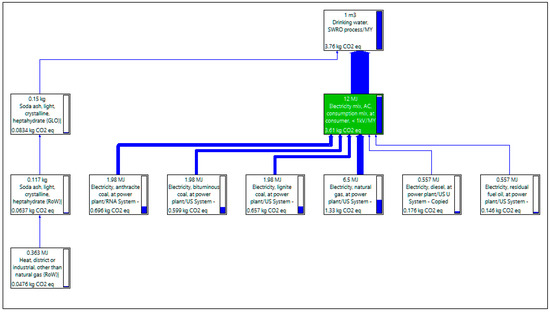 Based on the percentage contribution between chemicals and electricity shown in Figure 6, the results are in agreement with those that were reported in Biswas [28], Sydney water, Cooley and Heberger, and Shahabi et al. [29,30,31]. The utility of electricity consumption was 3.613 kg CO2-eq, which was determined using the IPCC GWP 100 analysis, as shown in Figure 3. In addition, the utility of chemicals consisting of Polyaluminium chloride, Polyacrylamide, Soda ash, Hydrochloric acid, Sodium hydroxide, Chlorine, Sodium hydrogen sulfite, Sodium hypochlorite, and Calcium carbonate contributed a total of 0.146 kg CO2-eq (4%). According to Gobin et al. [32], the quantity of chemicals will be higher when the productivity of potable water production is higher. For example, the use of lime, fluoride, and carbon dioxide to reduce water hardness and produce good quality water can contribute to the carbon footprint. Furthermore, the potential of the carbon footprint occurred during the use of chemicals for removing impurities in the stage of freezing and sedimentation, with the need for an embodied energy of 22%. Based on Figure 6, the change in electrical utility is significant at 96%, which is equivalent to 2.8 kWh/m3 for water pumping, membrane operation, and water distribution to the main pipes. Based on the work by Raluy et al., Stokes and Orvath, and Elimelech and Philip [33,34,35], several best recovery steps for electricity include installing an energy recovery device, and optimizing the pump use and membrane permeability. Fahad et al. [22] proved that the use and increase in the diameter of a membrane can also reduce the carbon footprint due to the high rejection of boron, bromide, and other relevant materials. Moreover, the details of research by Abdul Ghani et al. [36], which undertook a more in-depth examination related to the membrane potential than in the case of Senok study, is more relevant for further study in the future.