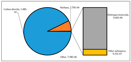 As mentioned previously, this SWRO Senok pilot plant project was developed on a small scale with a capacity of 500 m3 per day to cover a 3000 household population. The overall carbon emissions from the plant were small and resulted in an insignificant impact on the environment, as shown in Figure 7. The CO2 emissions were the highest contributor, at 3.48 × 10−3 kg CO2-eq, followed by methane at 2.70 × 10−4 kg CO2-eq. The other pollutants included the emissions of NOx and Sox, which were considered to be insignificant. These results are also consistent with the results of the Biswas and Yek study [27], which confirmed that the three major types of greenhouse gas emissions from decontamination operating plants are due to carbon dioxide, methane, and nitrogen dioxide gases. However, if the plant continues to operate completely on fossil fuel for the next 25 years, the emissions are expected to affect the health of the community. Fahad et al. [22] reported a similar pattern in their study, which found comparative results for CO2 emissions for their RO plants in the construction and operation stages, respectively, of 3.0 kg CO2 and 2.3 kg CO2. These emissions contributed to increased variances for numerous reasons. For example, if immediate controls are not implemented in each operational desalination plant, factors such as heat emission, energy consumption, and fuel transportation based on the capacity of different RO plant sizes can have an impact on the environment. Thus, the greater the greenhouse gas emissions, the greater the carbon footprint produced by a factory or plant. In conclusion, the control of GHG emissions can meet the agenda of the Kyoto Protocol for local climate change mitigation.
