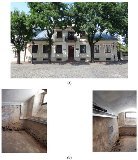 The building under study, located in the city of Łowicz (Poland), is a former monastery. Nowadays, it is a rectory. The building was erected at the end of the eighteenth century, and it is a member of the historic buildings group, which is a part of the northern frontage of the Old Market Square in Łowicz. The building is recorded in the provincial register of monuments. Pictures of the building and its basement are shown in Figure 1. The building is made of a red fired brick and lime-based joints. In the basement, the masonry’s thickness ranges from approximately 60 up to 80 cm. Moreover, on the internal side, the walls in the basement are covered with a lime-based plaster with a thickness of approximately 2–3 cm, while on the external side, they are partially in contact with the soil. The plan of the basement is presented in Figure 2, while the structure of the considered masonry walls with the drying hole and heating probe is shown on Figure 3.