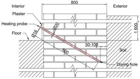 The drying process was carried out by applying the thermo-injection method, which is a convective drying method [3,4]. In the first step of this method, at the internal side of the wall segment, a set of 20-mm drying holes every 15 cm and at an angle of 30° from the horizon was prepared in 2 staggered rows. The depths of the holes were selected in a such way that they ended approximately 5–10 cm from the external side of the wall. A cross-section along a single drying hole is presented in Figure 3, while the hole’s spatial distribution is shown in Figure 4. Then, dedicated heating probes were mounted in the upper row, which heated the wall and provided air to the holes for drying. When the drying process decreased the moisture content of the wall to approximately 3–4% wt., the heating stopped, and the second step of the thermo-injection method began. In this step, the special hydrophobic silicone micro-emulsion was injected under elevated pressure by applying dedicated injectors mounted in all the holes. This silicone micro-emulsion penetrated the wall material and created a waterproof membrane in the masonry wall. The lower the moisture content and the higher wall temperature (not exceeding 60 °C due to cross-linking of the silicon emulsion in a temperature above 62 °C), the deeper the penetration of the silicon micro-emulsion into the wall material, as explained in [3]. In the third step of the thermo-injection method, the wall structure was recreated by filling the holes with the dedicated mortar and by covering the wall with the new plaster.