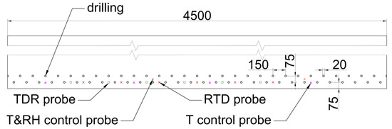 Spatial distribution of drying holes and the positions of sensors in the wet masonry wall (dimensions in mm; RTD = resistance temperature detector, T = temperature, T&RH = temperature and relative humidity and TDR = time domain reflectometry).