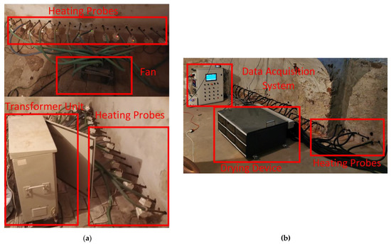 The investigation of the drying process in real masonry walls was carried out by applying two drying devices: the currently used device (CUD) presented in Figure 5a and the novel prototype device (NPD) presented in Figure 5b. Both devices are compared in Table 1. The CUD consists of several separate fans, which supply drying air to the heating probes, a separate transformer, which supplies power to the heating probes, and several dozens of heating probes. In this research, the CUD was configured to dry 8.5 m of the masonry wall using 60 24 V AC drying probes of 40 W, each grouped in 10 sections of 6 probes with independent overcurrent protection and 3 AC centrifugal fans. Pipes were connected to the manifolds mounted at the fan outlets. The pipes from the fans to the probes had different lengths, which resulted in uneven air distribution between the probes. The fans worked with constant power, and no automatic control system was integrated with this device. The NPD had a smaller working length equal to 5 m of the masonry wall and used 35 24 V AC drying probes of 40 W each. The probes were grouped into 7 sections of 5 probes with independent power control systems for each section. This device had 2 integrated DC fans with variable speeds. The heating probes and fans were powered from the transformer and DC supplier, respectively. The pipes connecting the drying probes and the device all had the same length. The prototype was remotely controlled with the use of a mobile application. Moreover, temperature and relative humidity sensors were added to control the drying process and device operation. All elements of the NPD (e.g., the transformer, fans, manifolds, control system and DC supplier) were integrated into a single chassis. The detailed description of this device was presented in [3].