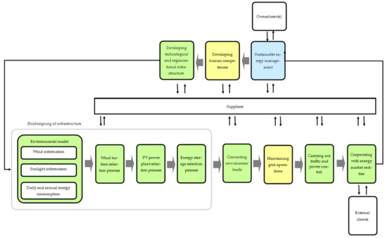 - Developing human competencies—continuous education in microgrid infrastructure operation, its control and cooperation with external entities; in this process, we define the criteria for the selection of microgrid employees, and in the case of only one owner, we develop and implement a training program dedicated to handling microgrid processes; and