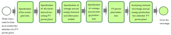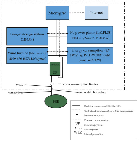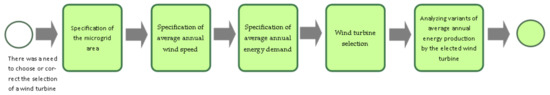 - 2019–2020—Phase II: Real-world experiment and implementation of the infrastructure processes to (re)designing of processes in a selected household microgrid. Key activities: defining the microgrid model and its leader/operator, energy mix covering the demand for power and heat; describing the sub-processes of the infrastructure (re)design process: wind turbine selection, PV power plant selection and energy-storage selection; gathering data and carrying out analytical measurements of these sub-processes in selected households. Material collected: standardization of input energy parameters for sustainable power consumption of household buildings; average 24-h and annual energy consumption and its electrical characteristics; analysis of variants of average annual electric power production of selected wind turbine and PV power plants; analysis of variants of energy storage and voltage converter selection; description of identified sub-processes, and development of procedures in the event of sub-optimal selection of the microgrid infrastructure.