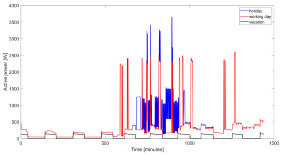 - 2021—Phase III: Computer simulation of the established three sub-processes of (re)designing of infrastructure during real-life experiment. To verify the correctness of the selection of microgrid elements, a computer model has been created that considers the power demand profiles developed based on the authors’ own measurements for the working day, holiday, and the vacation period when household members are away.