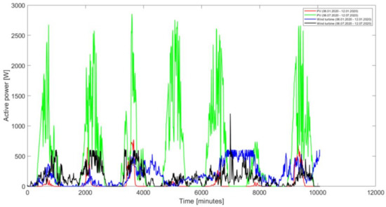 - profiles of electric power consumption for active and reactive power are known, as well as the measurements of solar radiation intensity and wind speed for the simulated period of the microgrid operation;