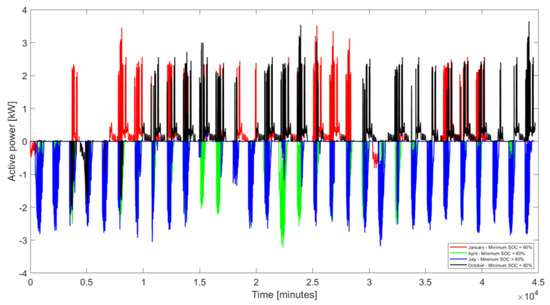 - if generated active power is less than the power demand and the SOC of the energy-storage device is less than or equal to the minimum permissible level, the missing power will be imported from the distribution network and