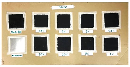 The test samples were prepared using a simple chemical mixing method. Black paint was considered as the base matrix to paint onto an aluminum plate and Si nanoparticles in the various fractions 0.5, 1, 3, 5, 7, 10, 15, and 20 wt % were mixed in black paint. In brief, the nanoparticles were suspended in isopropyl alcohol (5 mL), sonicated for 1 h, and stirred for 5 h for proper suspension. The suspension was mixed with black paint using a mechanical mixer for 2 min and the now-formed formulation was applied to the aluminum plate using a hand brush. The samples were dried at room temperature for 24 h. The same procedure was repeated for each concentration. Figure 2 shows the prepared samples for testing.