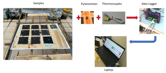 The same arrangement of samples, i.e., the silicon-coated nanoparticles, the plate coated with black paint, and the aluminum plate attached, were attached to a wooden sheet of a thickness of 1 mm and was mounted at an optimum inclined angle of 15 degrees. The layout of the outdoor experiment, including the position and connectivity of all the instruments and components, is systematically represented in Figure 4. The optimum angle was calculated using Cooper’s Equation (1) to intercept the maximum radiation throughout the day [22]. Note that the experiment was performed for seven days from 8:00 a.m. to 5:00 p.m. and only the best data with the maximum sun hours are presented here.