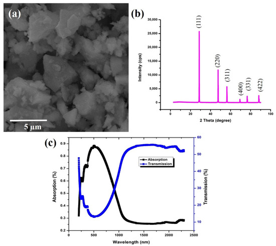 Figure 5a–c shows the scanning electron micrographs (SEM) of the as-received powder along with the X-ray diffraction (XRD) pattern and UV-vis spectra. The particles are of irregular shape with sizes ranging from micrometers to sub-micrometers; i.e., from 0.9–4 µm. The XRD pattern has been matched with the JCPDS#27-1402 card [23]. The peaks mentioned concerning the 2-theta axis corresponds to the silicon element. Figure 5c shows the light absorption properties of the as-received powder, which is of prime importance to this study; a sharp absorption in UV; and a visible range of the solar spectrum was identified, for which the levels in the near-infrared region and again a small absorption in the far-infrared region were also noticed. The corresponding light transmission curve is also presented in Figure 5c to better understand the optical properties.