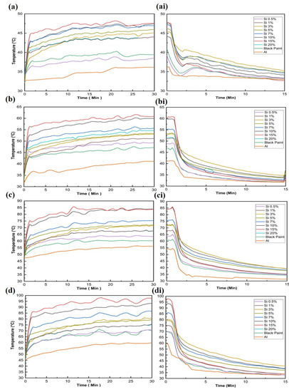The maximum temperature measured for specimens containing 0.5 wt % Si at 1000 W/m2 irradiations was 72.8 °C, which is 22.58% higher compared to bare aluminum plate and 1.39% higher compared to the black paint-coated aluminum plate. Specimens containing 1 wt %, 3 wt %, 5 wt %, 7 wt %, and 10 wt % exhibited the maximum temperatures of approximately 75.6 °C, 79.3 °C, 81.7 °C, 87.8 °C, and 93.4 °C, respectively. The highest temperature was attained in the case of specimens containing 15 wt % Si at a 1000 W/m2 irradiation level was 98.5 °C, which is 65.81% higher compared to the bare aluminum plate and 37.15% higher compared to the black paint-coated aluminum plate. A further increase in Si concentration in the black paint did not increase the surface temperature. For example, specimens containing 20 wt % Si in black paint exhibited 79.3 °C. This reduction in surface temperature is due to an excessive increase in thermal conductivity (cooling rate, Figure 6ai–di), which leads to an increase in thermal convective losses in the surrounding environment.