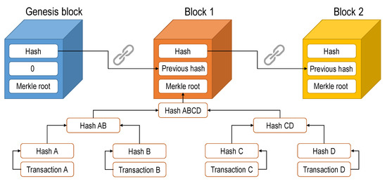 A combination of hashing and encryption is used for securing the various elements of the blockchain. The hash function transforms each input data point into a unique value of a fixed length so that no one can derive the original content from the hash value. Therefore, the additional security level is added, and the size of the incoming data is reduced. The transactions packaged into the block are hashed pairwise using the Merkle tree until a single hash value remains that forms the block’s Merkle root hash. The hash of the block itself is generated by hashing together the timestamp, hash of a previous block, Merkle root, and other important information. Therefore, blocks in a blockchain are interlinked as every block points to the previous block’s hash value except the genesis block. Such a link structure makes blockchain immutable, as changing a single data point would entail recalculation of the hash value of the respective block. As a result, all subsequent blocks will become invalid, and the modification will be rejected.