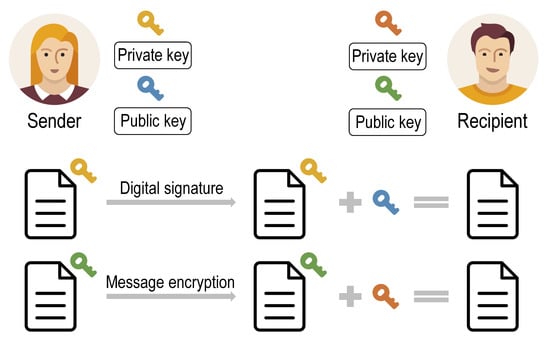 Blockchain uses asymmetric cryptography to encrypt and decrypt data based on public–private key pairs, as seen in Figure 2. The public and private keys are cryptographically linked so that the public key can be derived from the private key using a hash function, while the opposite is impossible. The transaction begins with sender and recipient exchanging their public keys, which are essentially their addresses within a blockchain network. Afterward, the sender signs the transaction digitally using a combination of their private key and the transaction’s hash value and encrypts the message with the recipient’s public key. The latter verifies the sender’s identity using a previously received public key and decrypts the message using their own private key.
