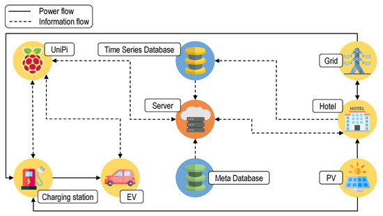 - The hotel is the main physical entity in the system architecture. The hotel is characterized by its load demand, which can be satisfied either by the rooftop PV or by the utility grid. The hotel sends the smart meter power measurements and the information about PV production to Time Series Database (TSDB). The hotel owner or the hotel manager interacts with the Server to issue charging requests to the charging station in manual mode.
