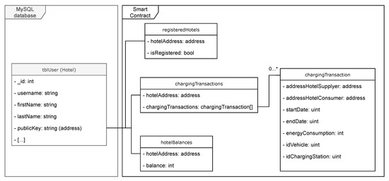 - Hotels are the central parties in the smart contract defined by their Ethereum addresses. Each hotel possesses at least one charging station and eventually one EV, uniquely differentiated by their idChargingStation and idVehicle identifiers. The charging stations and EVs do not have their own Ethereum addresses, as in the charging process they act on behalf of the hotel they belong to. Therefore, a charging transaction is conducted between two hotels, where one behaves as the energy provider and the other as the energy consumer. If the EV is charged at the hotel it belongs to, this hotel takes on a double role resulting in a transaction with itself. Each hotel stores the history of its charging transactions in the chargingTransactions list. The hotels’ respective energy balances are kept in the hotelBalances list, which can be queried by the hotel’s address. To participate in the charging process by issuing a charging transaction, the hotel’s registration is required and is verified using the onlyRegisteredHotels modifier.