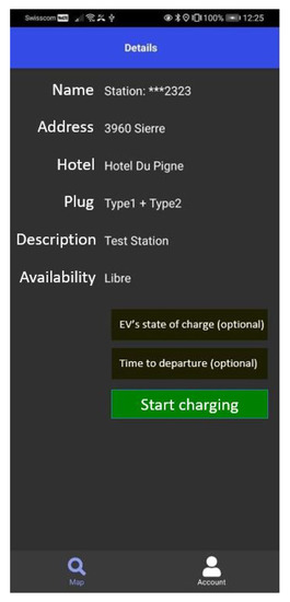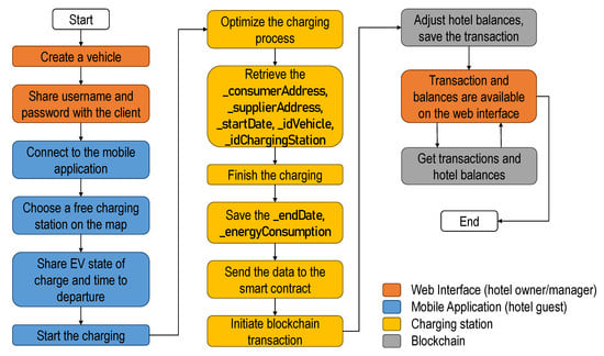 Figure 5 describes the steps of the EV charging process flow. The main entities implicated in the process are the hotel owners and managers, EV charging stations, and hotel guests. The prior participate in the process using the web interface detailed in Section 3.4, while the latter issue charging-related commands through the mobile application described in Section 3.5.