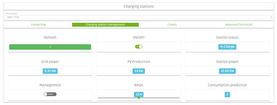 - The EV on the scheme represents both the vehicle itself and the EV driver, who interacts with the UniPi of the charging station using a mobile application. When the EV arrives at the charging station, the driver optionally sends out the information about the EV’s current state of charge and the amount of time the EV can spend at the charging station until the next departure. This information is used to optimize the charging process and deliver the highest PV self-consumption possible while satisfying the EV’s charging needs and maximizing the state of charge at departure. Further information about the optimization procedure can be found in [42]. If no supplementary information is provided by the driver at arrival, the charging process proceeds without the optimization feature.
