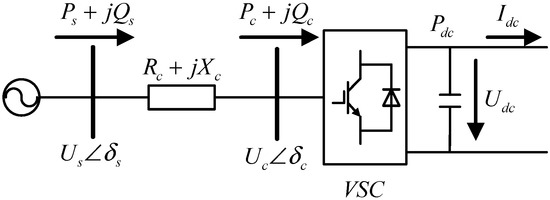 Before calculating the tidal distribution of DC distribution network, it is necessary to establish an equivalent circuit for the converters commonly found in DC distribution networks, and obtain the mathematical model of a DC distribution network. The voltage source converter (VSC) has obvious advantages in tidal current reversal and control, compared with the current source converter (CSC). In Figure 1, Rc + jXc is the equivalent impedance of the converter, Rc is the equivalent resistance of the transformer and the converter reactor (Ω), Xc is the equivalent reactance of the converter (Ω), Ps and Qs represent the active (W) and reactive power (Var) of the AC bus, Pc and Qc represent the active (W) and reactive power (Var) of the AC side, Us and δs represent the line voltage amplitude (V) and phase angle (rad) of the AC bus, Uc and δc represent the line voltage amplitude (V) and phase angle (rad) of the AC side, and Pdc and Qdc are the active power (W) and reactive power (Var) of the DC side for the converter, respectively.