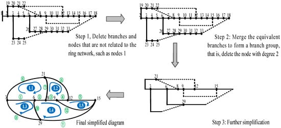 As can be seen in the final simplified diagram generated in Figure 2, with all tie-switches closed, the original IEEE33 distribution system is reduced to an equivalent diagram containing 12 branched groups of 5 loops (L1–L5).