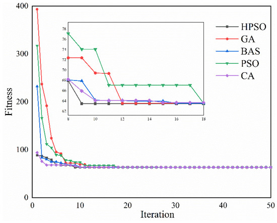 Table 1 shows the parameters of different algorithms. This paper mainly considers the proposed HPSO in comparison with PSO, CA, GA, and BAS. The population size and maximum number of iterations are kept consistent for all algorithms. In addition to the variables that have already appeared, it is necessary to account for the added parameters. In GA, pc, pm, pw, and pn denote the crossover probability, the exchange variation probability, the inverse variation probability, and the addition probability, respectively. The η in BAS denotes the coefficient of variable step size.