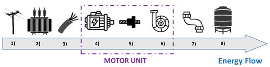 The equipment/components with the most significant possibility of intervention in order to reduce energy losses are the electric motor and the centrifugal pump [17], as they are the equipment that presents the highest losses in a pumping system. Table 1 presents the description of the components in Figure 1 and the approximate typical efficiency of each one of them.