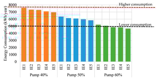 It was observed that in the scenario of 50% pump efficiency, it presented median energy consumption values ranging from 6959 kWh to 5970 kWh from IE1 to IE5. The level of efficiency increased gradually according to the class of electric motors, obtaining a difference of 4% with IE2, 5% with IE3, 7% with IE4, and 9% with IE5 (Figure 4). However, comparing the efficiency of 50% (IE5) with 40% (IE5), I obtained smaller reductions in energy consumption, 518 kWh/year, compared to IE1 and difference between the scenarios of up to 108 kWh/year.