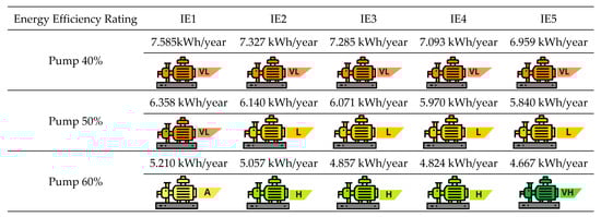 The energy consumption and energy efficiency scale was elaborated based on the efficiency classes of the motors and on the efficiency range of the pumps of 40%, 50%, and 60% considered in this study. This scale was created with the objective of classifying building water pumping systems, mainly for vertical multifamily buildings, classifying as Very High (VH), High (H), Average (A), Low (L), or Very Low (VL).