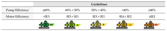 In the pump efficiency range between 40% and 50% for all motor energy efficiency classes, it is possible to obtain energy efficiency level “A”. Thus, it is observed that without major difficulties, it is possible to reach average levels of energy efficiency, which can help in total energy efficiency when considering the complete building, especially in cases of retrofit. Finally, centrifugal water pumps with efficiency greater than 40%, considering efficiency classes IE2, IE3, and IE4 of electric motors, it is possible to obtain efficiency level “L”. For pump efficiency and motor efficiency class less than 40% and IE2, respectively, it is only possible to obtain a “VL” efficiency level, being the worst energy efficiency rating.