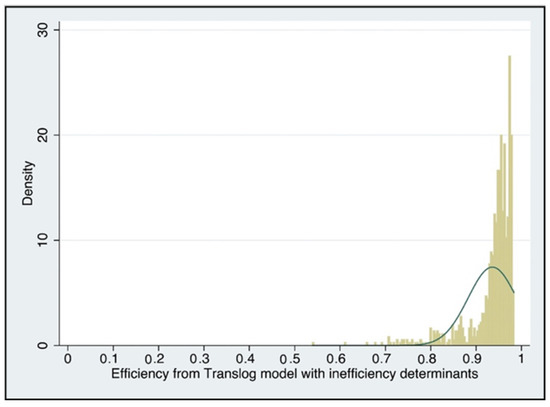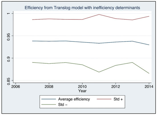 Figure 2 shows the distribution of efficiency scores for the firms using the translog specification with inefficiency determinants. The average efficiency in the sample is 93.6%, in line with previous studies of Norwegian electricity networks (see, for instance, [26]). Figure 3 shows the average efficiency score for each year. It appears as though the average level of efficiency was fairly steady year on year, although possibly with a slight indication of a decrease towards the end of the sample. It also appears as though firms’ performance increasingly diverged over time. This should be of interest to the regulator and indicate that there are possible efficiency improvements possible among DNOs.