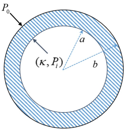 When the internal pressure Pi > Pe, the sheath will form a plastic zone inside, and ρ is the yield radius (a < ρ < b). Within its plastic zone, satisfying the equilibrium Equation (4) and satisfying with σr (a) = Pi = −p at the boundary, the stress distribution in the plastic zone of the sheath under the coupling between temperature and stress can be obtained as follows,
