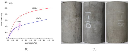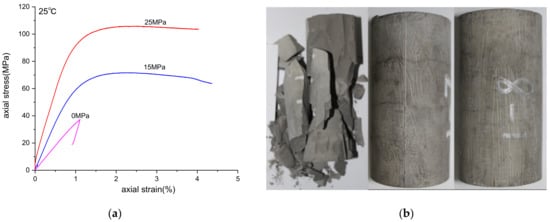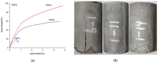 Under uniaxial condition, the failure mode of cement is tensile failure. With the increase of temperature, the strength of cement decreases, but its plastic properties gradually appear. With the increase of pressure, the samples mainly have axial compression deformation, and the lateral expansion is small. After the test, no macro-cracks are observed on the sample surface, which shows a good ability to resist deformation and failure. The value of σ1–σ3 is in accordance with 2% of the plastic strain and σ1 is the compressive strength. Combined with the stress–strain curve, it can be seen that the cement has strong ideal elastic–plastic characteristics, which also verifies the accuracy of the cement mechanical model.