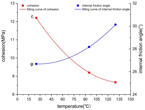The internal friction angle φ reflects the internal friction between the particles in the rock, including the sliding friction caused by the roughness of the particle surface and the occlusal friction caused by the movement of particles due to the embedding, interlocking and disengagement of particles. As shown in Figure 6 and Table 3, the internal friction angle of the cement is 26.68° at room temperature, 28.17° at 95 °C, and 30.13° at 130 °C, which are 5.58% and 12.93% higher than that at room temperature respectively. This indicates that although the high temperature causes the connection of the cement to become relatively loose, the frictional resistance inside the cement increases relatively. Due to the great difference in composition, this result is opposite to Bitouri’s [36].
