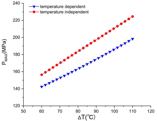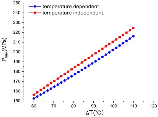 The in-depth extension magnifies the maximum cycle, regardless of the change of cement material properties, as shown in Figure 9. This is because the growing of depth will heighten the external pressure, which can protect the sheath. However, since the material properties are affected by temperature, the curve considering material damage is always below the red one without considering material property damage. That indicates that the Pmax is weakened due to the change of cement properties. After subtracting the two, as shown in Figure 10, it is found that the difference shows a non-linear increase with the temperature difference and its growth trend gradually slowing down.