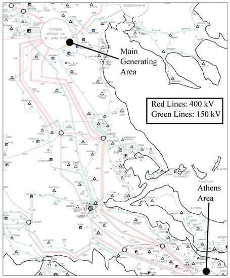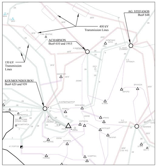 At the time of the July 2004 incident, the main generating area in the Hellenic Interconnected System was located at the northwest of the country, while the majority of the system load is concentrated at the southern part of the system, which includes the metropolitan area of Athens. Thus large amounts of power were transferred in the north–south direction, mostly by the 400 kV lines of EHV transmission system. These lines are shown with red in Figure 2, which includes a part of the Hellenic system. There are three, double circuit, EHV transmission lines connecting the buses shown in Table 1, which form a ring around Athens, as depicted in Figure 3.