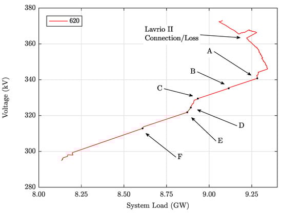 System deterioration is temporarily inhibited when the Lavrio II unit, located in the eastern part of Attica, is connected at , but its sudden loss during load pickup at brings the system again to an over-stressed state, as shown in Figure 5. From thereon, the continuous increase of system load activates more OELs, while the activation of ACLs ramps down the active generation of the thermal units near Athens, raising the need for additional remote active power dispatch towards Athens. At , the Aliveri III unit is disconnected (point A at Figure 5) followed by undervoltage trips of Aliveri IV (point B), Ag. Georgios 9 (point E), Lavrio I and Ag. Georgios 8 (point F) and finally the system collapses at .