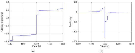 Voltage instability is reached at as determined by the calculation of the critical eigenvalue of long-term state matrix and sensitivity analysis, using the methodology described in Section 4.1. In particular, at this time instant, the critical eigenvalue of the unreduced long-term Jacobian matrix passes through zero, as shown in Figure 6a, while the sensitivities of total reactive generation to the reactive loads change sign from large positive to large negative, as shown in Figure 6b, which shows the response of the sensitivity corresponding to load of HV bus 737 at Piraeus.