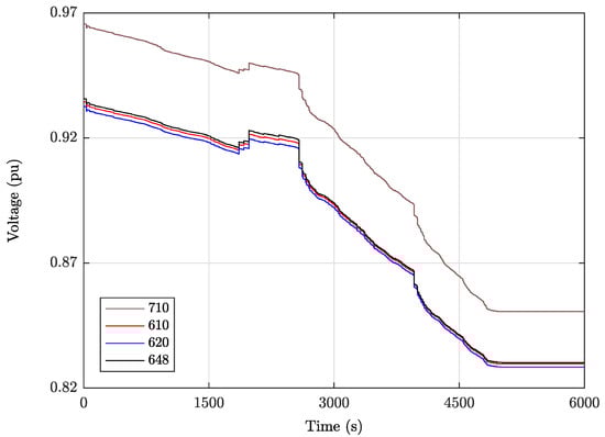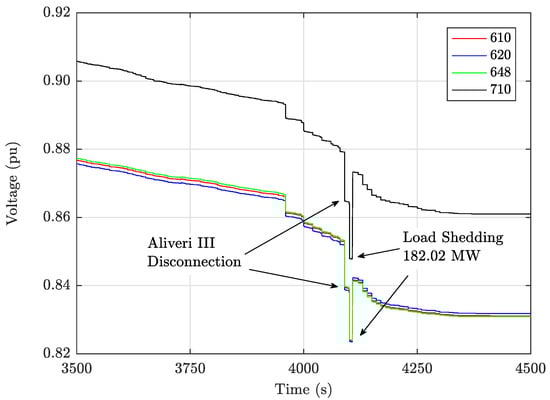 The response of the power system after load shedding is shown in Figure 13, where the voltage response of the EHV buses 610, 620 and 648 and HV bus 710 is depicted. It is clear that the system is saved and reaches a new long-term equilibrium at with the voltages being above pu, with adequate margin from the transmission line protection relays voltage threshold mentioned in Section 3 ( pu).